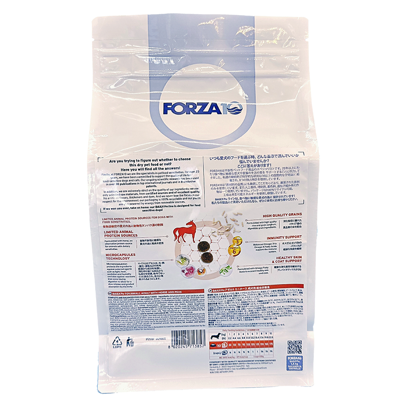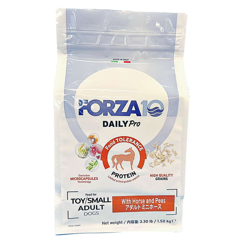 ミニ / ミディアム :馬肉、きび、全エンドウ豆、精米、トウモロコシプロテイン、米ぬか、ビール酵母、精製鶏脂、ビートパルプ、魚油、加水分解された動物性蛋白質、炭酸カルシウム、フラクトオリゴ糖、パパイヤ、パイナップルの茎、ユッカシジゲラ、濃縮アロエベラジェル、ビタミンA、塩化コリン、DL-メチオニン、ビタミンE、ザクロ、硫酸亜鉛一水和物、銅アミノ酸キレート、ミックストコフェロール(保存料として使用)、ローズマリーエキス