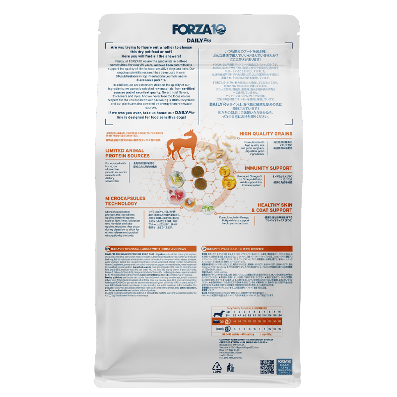 ミニ / ミディアム :馬肉、きび、全エンドウ豆、精米、トウモロコシプロテイン、米ぬか、ビール酵母、精製鶏脂、ビートパルプ、魚油、加水分解された動物性蛋白質、炭酸カルシウム、フラクトオリゴ糖、パパイヤ、パイナップルの茎、ユッカシジゲラ、濃縮アロエベラジェル、ビタミンA、塩化コリン、DL-メチオニン、ビタミンE、ザクロ、硫酸亜鉛一水和物、銅アミノ酸キレート、ミックストコフェロール(保存料として使用)、ローズマリーエキス